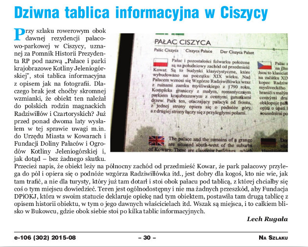 Wrzucam tu linka do mojego artykułu o zapomnianej byłej rezydencji namiestnika Wielkiego Księstwa Poznańskiego pod Karkonoszami i jego córce Elizie Radziwiłłównie. Na końcu artykułu zwracam uwagę, że przy drodze wiodącej obok pałacu w Ciszycy brakuje rzetelnej tablicy z informacją o tym miejscu dla turystów, a lokalnych władz i fundacji nie stać na ustawienie tam odpowiedniej tablicy poglądowej, przez co turysta przechodzący obok tego pałacu nadal nic się o jego historii i historycznych związkach tego miejsca z Polską nie dowie.