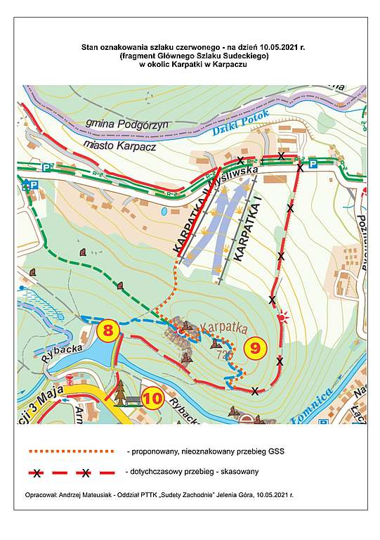 Przykro jest mi poinformować, że GSS w Karpaczu, w okolicy wzniesienia Karpatka – chwilowo nie posiada ciągłości. Szlak biegł po terenie prywatnym, a z właścicielem działki Oddział PTTK „Sudety Zachodnie” wraz z miastem Karpacz miał podpisane porozumienie, o zgodzie na ten przebieg do roku 2032. Jednak pod koniec ubiegłego roku, nowy właściciel działki wypowiedział porozumienie i poprosił o usuniecie naszego oznakowania, ponieważ będzie grodził swoją działkę, w związku ze zmianą sposobu jej użytkowania. Szanujemy własność prywatną i podjęliśmy działania celem znalezienia obejścia. W naturalny i logiczny sposób wybraliśmy wariant prowadzący przez punkt widokowy na Karpatce, gdzie dwa lata wcześniej, na zlecenie Miasta Karpacza, wyznakowaliśmy ścieżki spacerowe, uzyskując zgodę Nadleśnictwa Śnieżka, która administruje tym terenem. Obecna propozycja nowego odcinka GSS w dużej części wykorzystuje te oznakowane ścieżki spacerowe – patrz załącznik mapowy, gdzie zaznaczono alternatywny przebieg, bo chodzenie po lesie – póki co nie jest tam zabronione. Jednak, jak podało Nadleśnictwo Śnieżka w Kowarach – nie uzyskało ono zgody swojego zwierzchnika, Regionalnej Dyrekcji Lasów Państwowych we Wrocławiu na poprowadzenie GSS w tym miejscu. Zatem czekamy na taką zgodę, przepraszając za nie swoje grzechy.Mapka ilustrująca nieciągłość Głównego Szlaku Sudeckiego w Karpaczu i propozycja jego alternatywnego przebiegu.P.S. Obecnie trwają negocjacje pomiędzy ZG PTTK a Generalną Dyrekcją Lasów Państwowych w sprawie opracowania i uzgodnienia tekstu wzorcowego porozumienia, jakie będą zawierane pomiędzy poszczególnymi Oddziałami PTTK a Nadleśnictwami, w sprawie znakowania, utrzymania oznakowania szlaków i tworzenia nowych szlaków na obszarach Lasów Państwowych. Negocjacje te są następstwem wstępnego intencyjnego porozumienia zawartego pomiędzy naszą centralą a GDLP z jesieni 2019 r. Rozmowy, które prowadzi prezes ZG PTTK – Jerzy Kapłon są trudne, bo LP stawiają bardzo niekorzystne dla PTTK wymagania i sprawy szlaków widzą zgoła inaczej niż PTTK. PTTK i LP są skazani na współpracę i dobre stosunki wzajemne. Chcielibyśmy doprowadzić do takiego stanu jak jest w Republice Czeskiej pomiędzy Klubem Czeskich Turystów a Lasami Czeskiej Republiki. Dowodem tego są zielone tabliczki z treścią: „Lasy Czeskiej Republiki wspierają znakowanie”, na każdym słupie z drogowskazami postawionym w lesie. Jako PTTK mamy na terenach LP ponad 50 tys. km oznakowanych przez PTTK szlaków turystycznych. I tutaj apel do użytkowników szlaków: nie krytykujcie w czambuł różnych działań LP w mediach. Jeśli macie jakieś zarzuty w stosunku do szlaków, najlepiej napisać uwagi czy wnioski bezpośrednio do nadleśniczego, na terenie którego te niedogodności występują lub do dyrektora odpowiedniej Regionalnej Dyrekcji Lasów Państwowych. Andrzej Mateusiak, wiceprezes urzędujący Oddziału PTTK „Sudety Zachodnie” w Jeleniej Górze. Nasz e-mail: pttk@pttk-jg.pl
