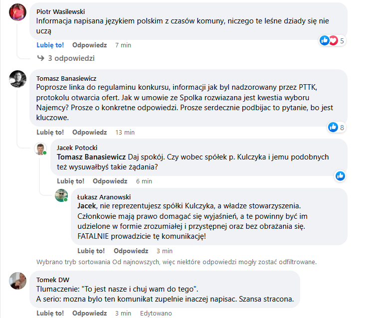 Dodaję też zrzut ekranu z komentarzami pod postem. Widać, że komunikacja władz Towarzystwa tylko podgrzewa emocje zamiast je gasić. Piszę o tym od 20 lat i jak kulą w płot...Ocena komunikacji władz Towarzystwa w sprawie Samotni pod oświadczeniem Prezydium ZG PTTK.Pozdrawiam, Łukasz