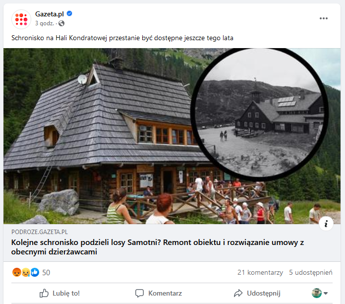 Fejsbukowy anons artykułu o schronisku na Hali Kondratowej