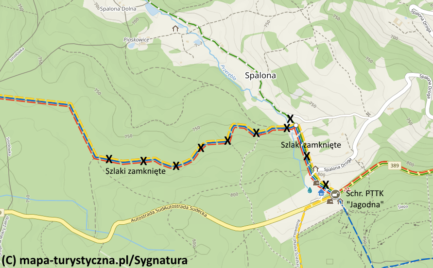 Mapa zamkniętych szlaków w okolicach schroniska PTTK Jagodna