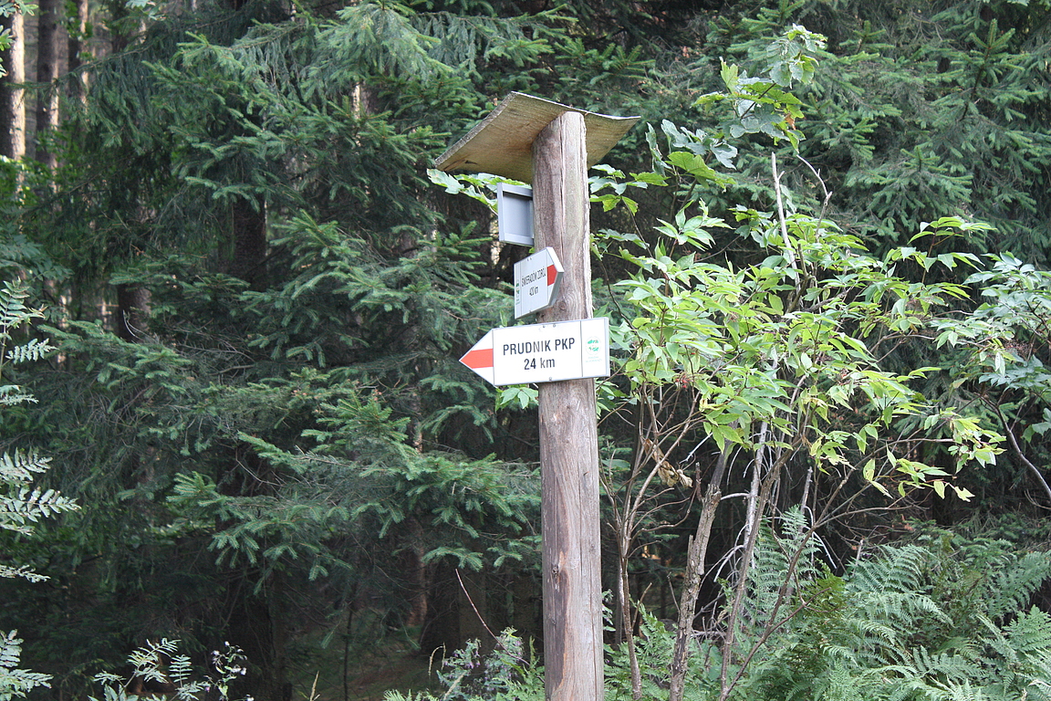 Otóż, drogowskaz (kierunek Prudnik) pokazuje zejście w las do widocznego między drzewami schroniska ale szlak tamtędy nie prowadzi. Powinien on być obrócony o 180 stopni, grotem w prawą stronę zdjęcia i pokazywać dalszą wędrówkę granicą państwa do szczytu Biskupiej Kopy.